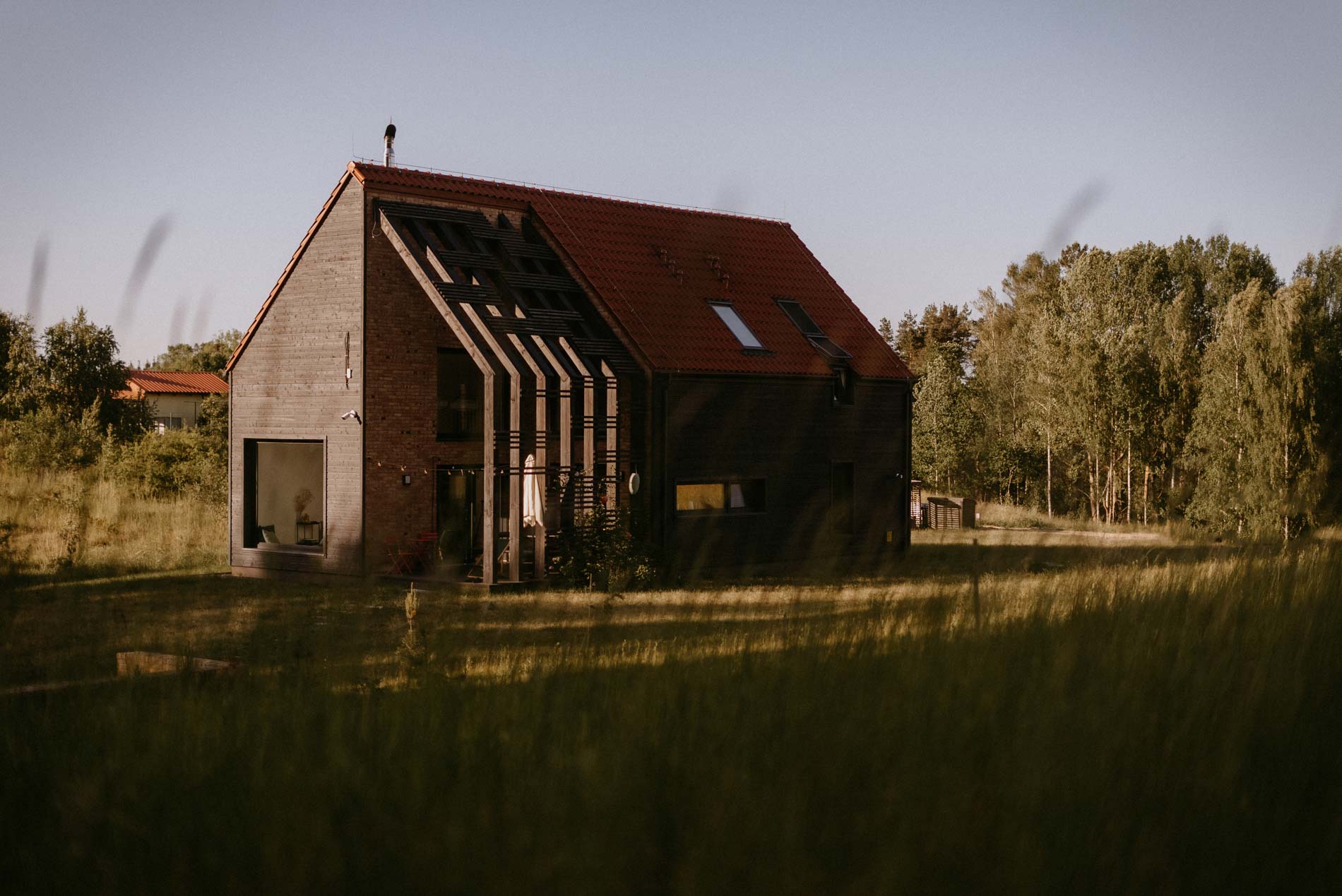 Dom to połączenie dwóch światów: nowoczesnego designu i tradycyjnych materiałów. Minimalistyczna, ale pełna charakteru bryła nowoczesnej stodoły przyciąga wzrok. Dachówka esówka, to nie tylko materiał – to kawałek lokalnej historii, a czarne deski na elewacji to hołd dla mazurskich stodół.